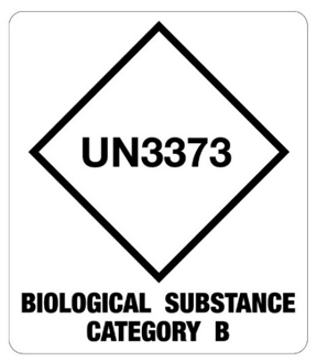v. For transport, the mark illustrated below shall be displayed on the external surface of the outer packaging on background of a contrasting colour and shall be clearly visible and legible. The mark shall be in the form of a square set at an angle of 45° (diamond-shaped) with each side having a length of at least 50 mm; the width of the line shall be at least 2 mm and the letters and numbers shall be at least 6 mm high. The proper shipping name “BIOLOGICAL SUBSTANCE, CATEGORY B” in letters at least 6 mm high shall be marked on the outer packaging adjacent to the diamond-shaped mark.